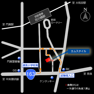 国道163号線より「試験場入口」交差点を北方面(京阪古川橋駅方面へ)に向かい、1つ目の信号(3差路)を左に入り、次の交差点を左折し、すぐの南向きT字路を南に入ります。小学校に付きあたりを右に曲がり、道なりに進むと当店が右側に見えます。