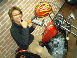通称 『アートクリエイター』 として活躍しているBIG-SIGNの澤田氏。関西を中心にオートバイ、クルマなど数々のショーモデルのピンストライプを手がける一方で、乗り物だけではなくアパレル関係のデザインやショップのショーボード、店内のデコレーションも手がけています。 あの『VonDouth(ボンダッチ)』の正規代理店(大阪店)のサインボードも彼の作品の一つです。 今後も彼の活躍はYo-ちぇっくですぞ! |