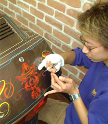 ピンストライプの説明1950年代からカーカルチャーへ浸透したと言われています。 その内容は、文字通り細いラインで直線を基本に様々なデザインを特殊な筆を使い様々なものをデザインしていく技法です。 現在アメリカ西海岸などでは一般の方からカスタムカーを愛好されている方まで幅広く使用されています。 |