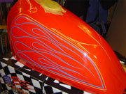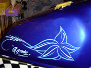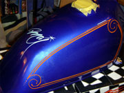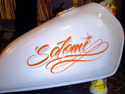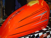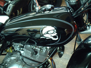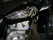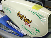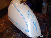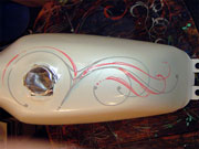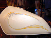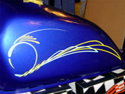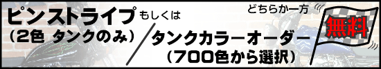 ピンストライプに関しては1台1台手作業でのオリジナルタンクになりますので、ピンストライパーとの打ち合わせにより好みの色やイメージをお聞きし、デザインを考えていきます。 2色という色は少ないように思われるかもしれませんが、ピンストライプというものはデザインのみでかなりの表現が出来るので、是非この機会にお試し下さい。 |