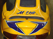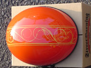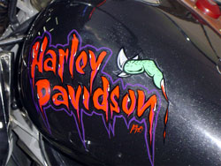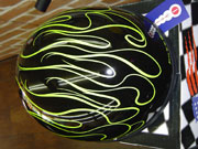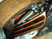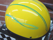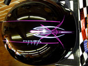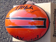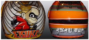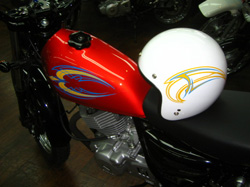 ピンストライプで自分の名前をデザインする・・・即ち、世界に一つしか無いデザインを自分独りだけのブランドとしての創造物として築き上げる。 (※:写真ではヘルメットだけですが、タンク・フェンダーその他様々なパーツへのペイントも行っております。是非一度ご相談下さい。) |