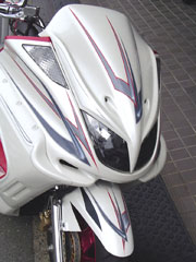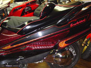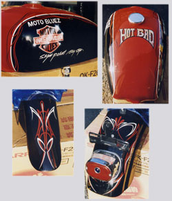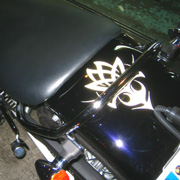 エムスタイルでは一般のオートバイ(ヘルメットも可能)の持ち込みでピンストライプやペイントも受け付けております。『ピンストライプ=高価なイメージ』がありますが、本来元々のカラーを活かしペイント無しで低価格でのイメージアップをすることの出来る技法です。 もちろん、車体のエンブレムをはずしレタリングでのオリジナルエンブレムを書く(\3,000〜(消費税別))だけのオーダーでもOKです。 |