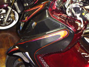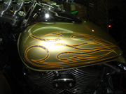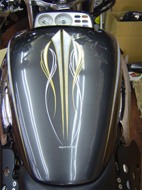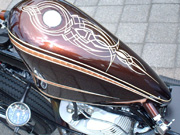 バイクへのピンストライプへの定番、タンクへのピンストライプ加工。定番の2色までのものであれば通常のキャンペーン等での適応もありますが、下記写真のようなゴールドリーフやシルバーリフ、また、その他様々な色のリーフ加工が出来ます。