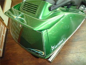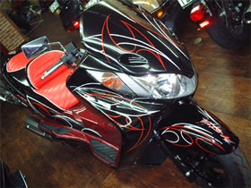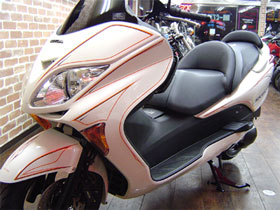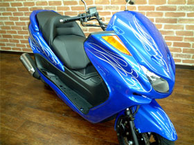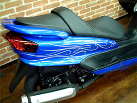 只今ビッグスクーター(フォルツァ・スカブ・フュージョン・マジェスティー等)をお買い上げの方に、ピンストライプの無料キャンペーンを行っております。ペイントだけではいまいちインパクトが欠けると思われる方や、レタリング(文字を書いたり)をしてオリジナリティーを出すなど様々なパターンをオリジナルでお選びいただくことが出来ます。もちろん、エアロのアウトラインをひらいボディーをロング&ロースタイルに魅せることも可能です。