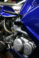 トラスフレームに違和感無く取り付けられたカウルステー。そこから伸びたフレームスライダーは、ノーマルのVTR250のフレームスライダー取り付け位置とは大きく異なり、出幅等もあるはずなのに、コンパクトに抑まっている。