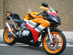 一見、CBR600RR?と思えるフロントカウル。実は完全なオリジナルカスタムモデル。2昔も前のレプリカデザインとは一線を画し、250ccならではのコンパクトさとエッジを効かせたデザインはまさに大排気量レプリカ時代を先どるクオーターレプリカ。