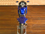 完全カスタムメイドのアルミ削り出しのトップブリッジ。元々アップハンドルであるVTR250をセパレートハンドルにする事は、あり溢れているアフターパーツの世界の中では容易なことではあるが、カウルを採用したことによる様々な問題や近年のレプリカスタイルに仕上げるための自然なハンドルの垂れ角等はオリジナルならではである。